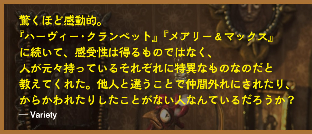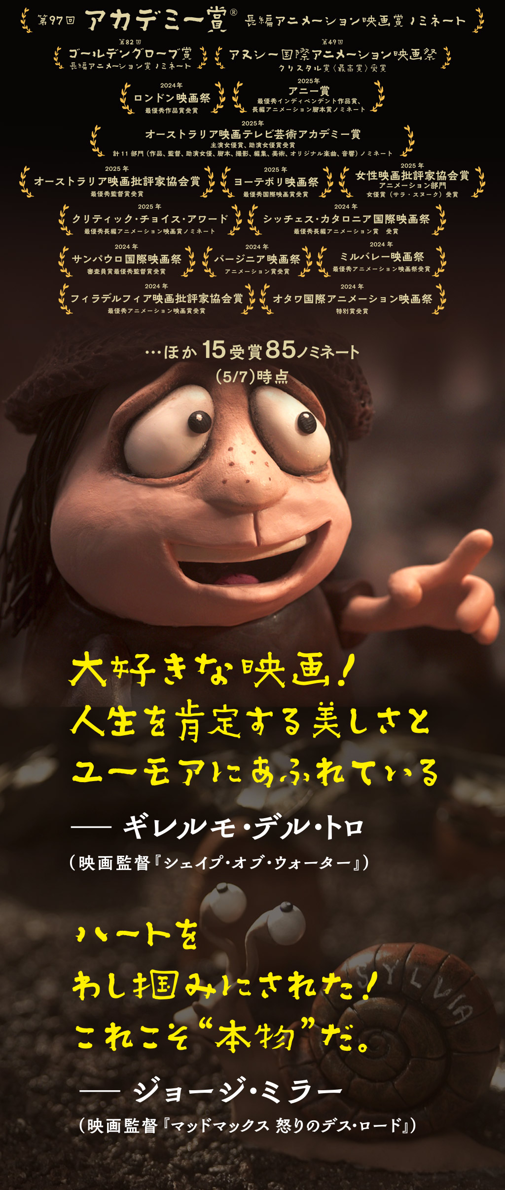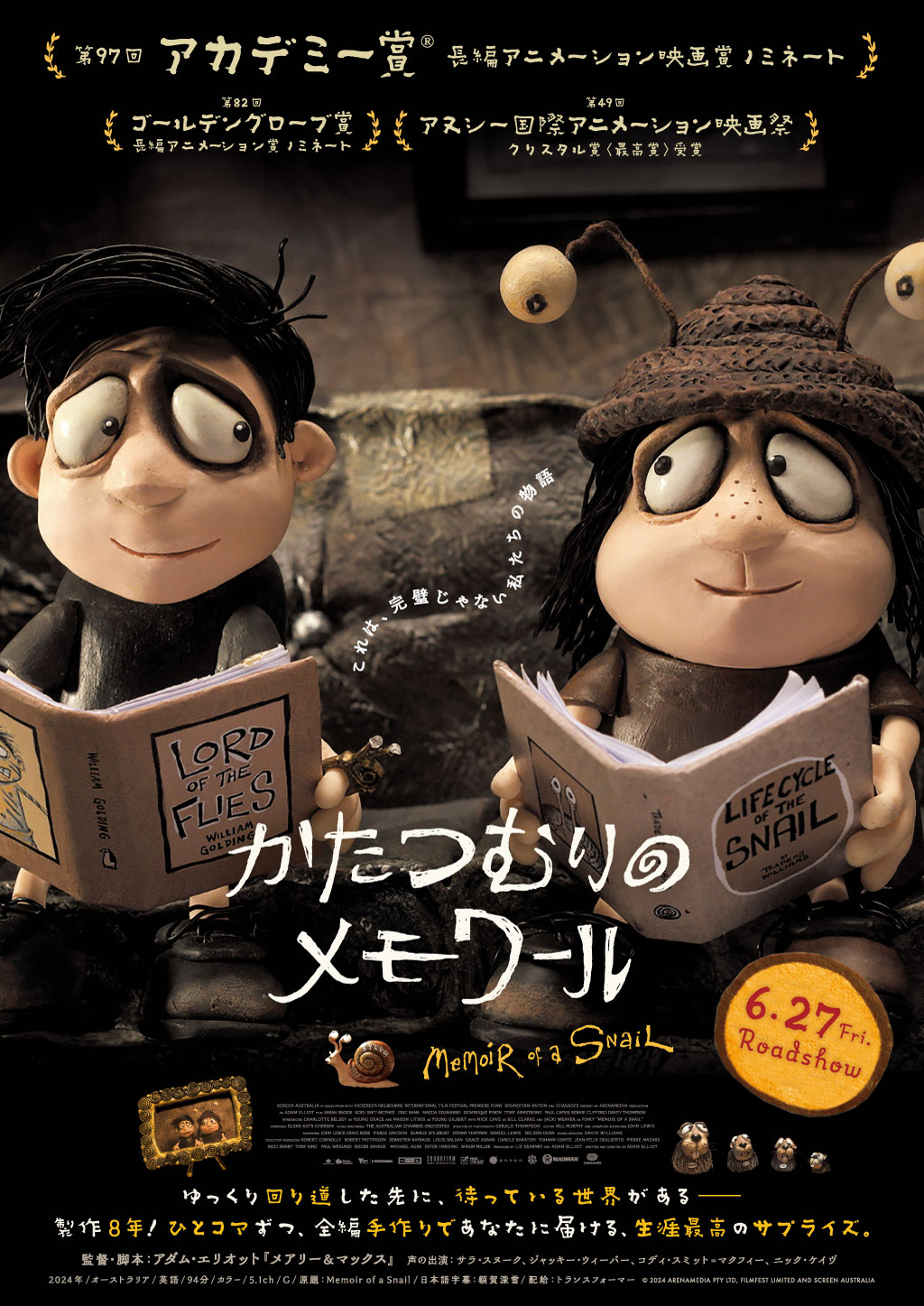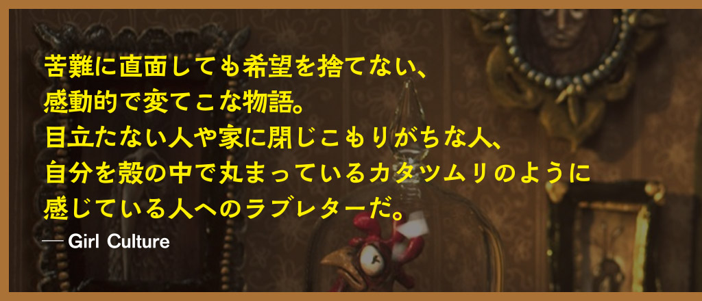 幼い頃から周囲になじめず、孤独を抱えて生きてきた女性グレース。かたつむりを集めて寂しさを埋める日々を送っていたが、個性豊かな人たちとの出会いと絆を通して、少しずつ生きる希望を見出していく… 時にブラックユーモアやビターな現実も織り交ぜながら、波乱万丈な人生の喜びと悲しみを優しく描いた、感動のクレイアニメーション。『メアリー&マックス』のアダム・エリオット監督が8年の製作期間をかけ、
